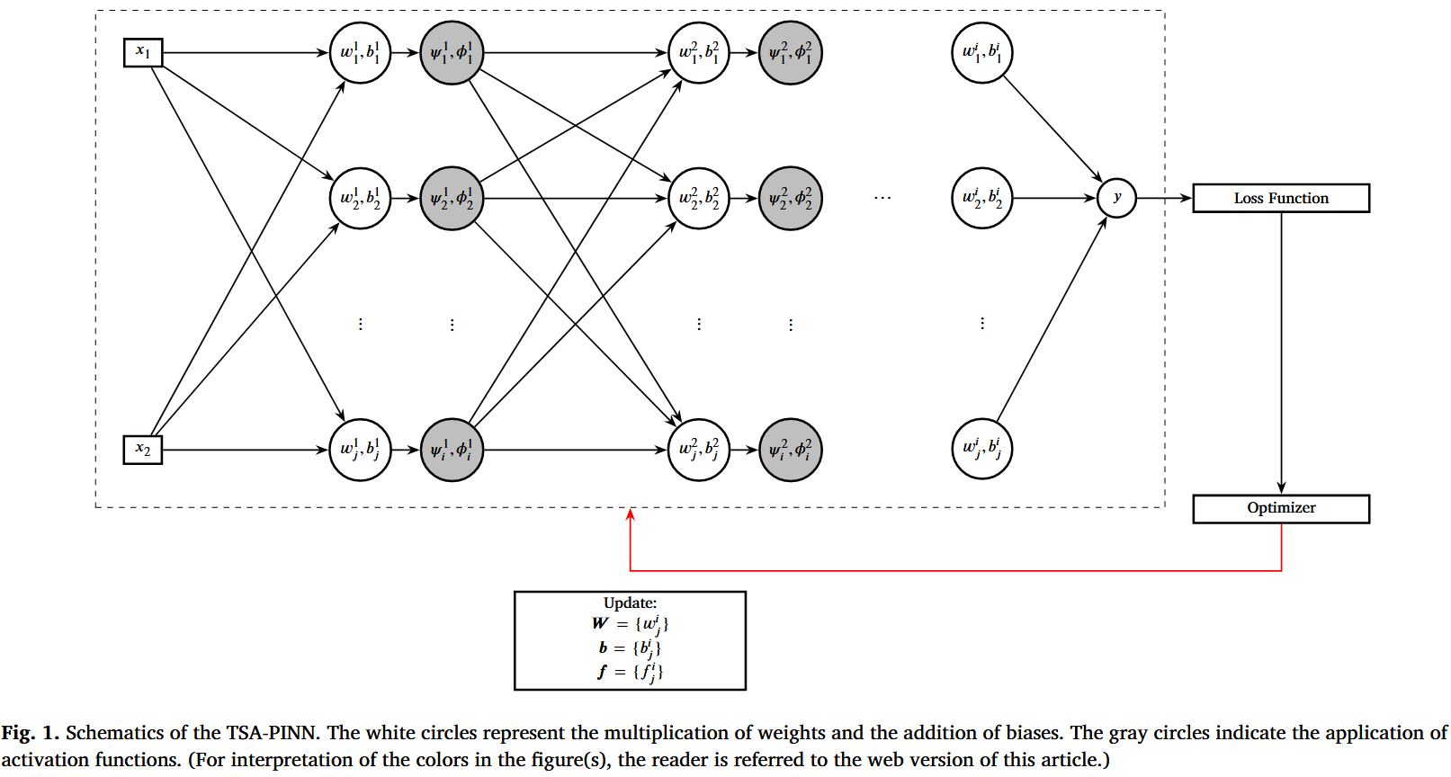普遍逼近定理证明,即使是带有单一隐藏层的简单多层感知器,也可以通过增加神经元数量,以任意精度近似任意连续函数[43–45]。PINN 模型中广泛使用的架构是前馈神经网络(FFNN),由多个完全连接的层组成。每个神经元在某一层的输出描述为