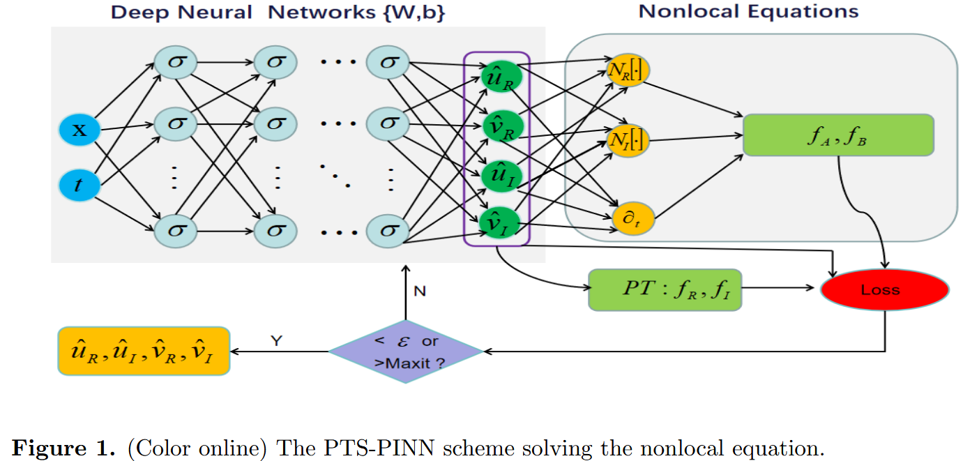 本文大纲组织如下:第二部分简要介绍 PTS-PINN 的主要思想。在第三部分,我们给出了非局部 NLS 方程、非局部导数 NLS 方程和非局部(2+1)维 NLS 方程的多组独立实验,以展示 PTS-PINN 的有效性。数据驱动的流氓波解、周期波解、呼吸波解通过 PTS-PINN 方案进行研究。此外,应用 PTS-PINN 方法,第 4 节讨论了非局部(2+1)维 NLS 方程和非局部三波相互作用系统的数据驱动参数发现。结论见最后一节。
