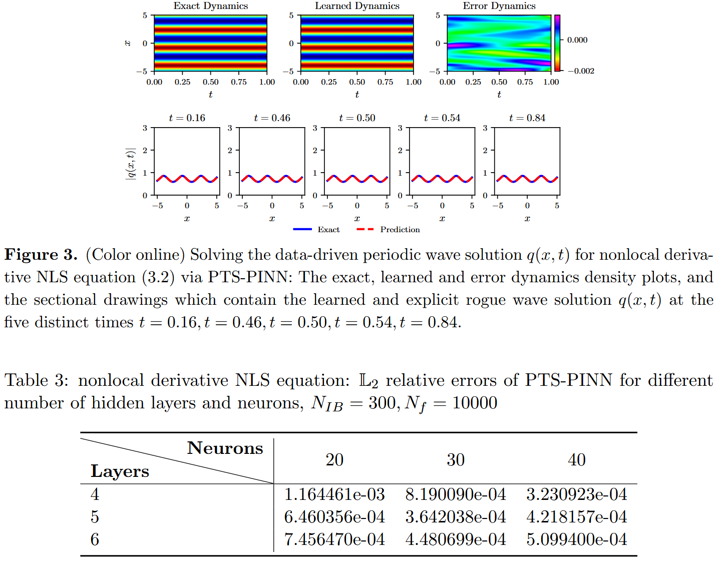 非局部导数 NLS 方程(3.3)的解析解为 q ( x , t ) = ( 8 − 8 i ) ( i e i ( t − 3 x ) − 16 e i ( t − x ) ) ( i e − 2 i x + 16 ) 2 q(x,t) = \frac{(8−8i)(ie^{i(t−3x)}−16e^{i(t−x)})}{(ie^{−2ix}+16)^2} q ( x , t ) = ( i e − 2 i x + 16 ) 2 ( 8 − 8 i ) ( i e i ( t − 3 x ) − 16 e i ( t − x ) ) ,表示周期性波动解。目标是利用 PTS-PINN 学习该解 q ( x , t ) q(x,t) q ( x , t ) 。神经网络架构由一个五层全连接网络组成,每隐藏层有 20 个神经元,采用双曲切线(tanh)激活函数。空间区域 [ − 5 , 5 ] [−5,5] [ − 5 , 5 ] 被离散化为 512 个点,时间区域 [ 0 , 1 ] [0,1] [ 0 , 1 ] 被离散化为 100 个点。从 IB 数据中随机提取 N I B = 300 N_{IB} = 300 N I B = 300 点,N f = 10000 N_f = 10000 N f = 10000 点作为内区域的配缀点。在 PTS-PINN 方案的背景下,这些训练数据被处理以学习数据驱动的周期波解 q ( x , t ) q(x,t) q ( x , t ) 。得到的解显示出的 L2 范数误差为 6.460356e-04,相较于精确解。整个学习过程共计 20,262 次迭代,耗时约 874.7039 秒。相应的动态行为如图 3 所示,说明学习动力学与实际动态之间的误差可以忽略不计。此外,我们还讨论了 PTS-PINN 在不同隐藏层数、神经元、IB 点和配位点下的 L2 相对误差,见表 3 和表 4。