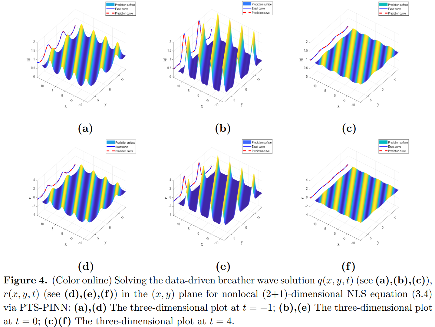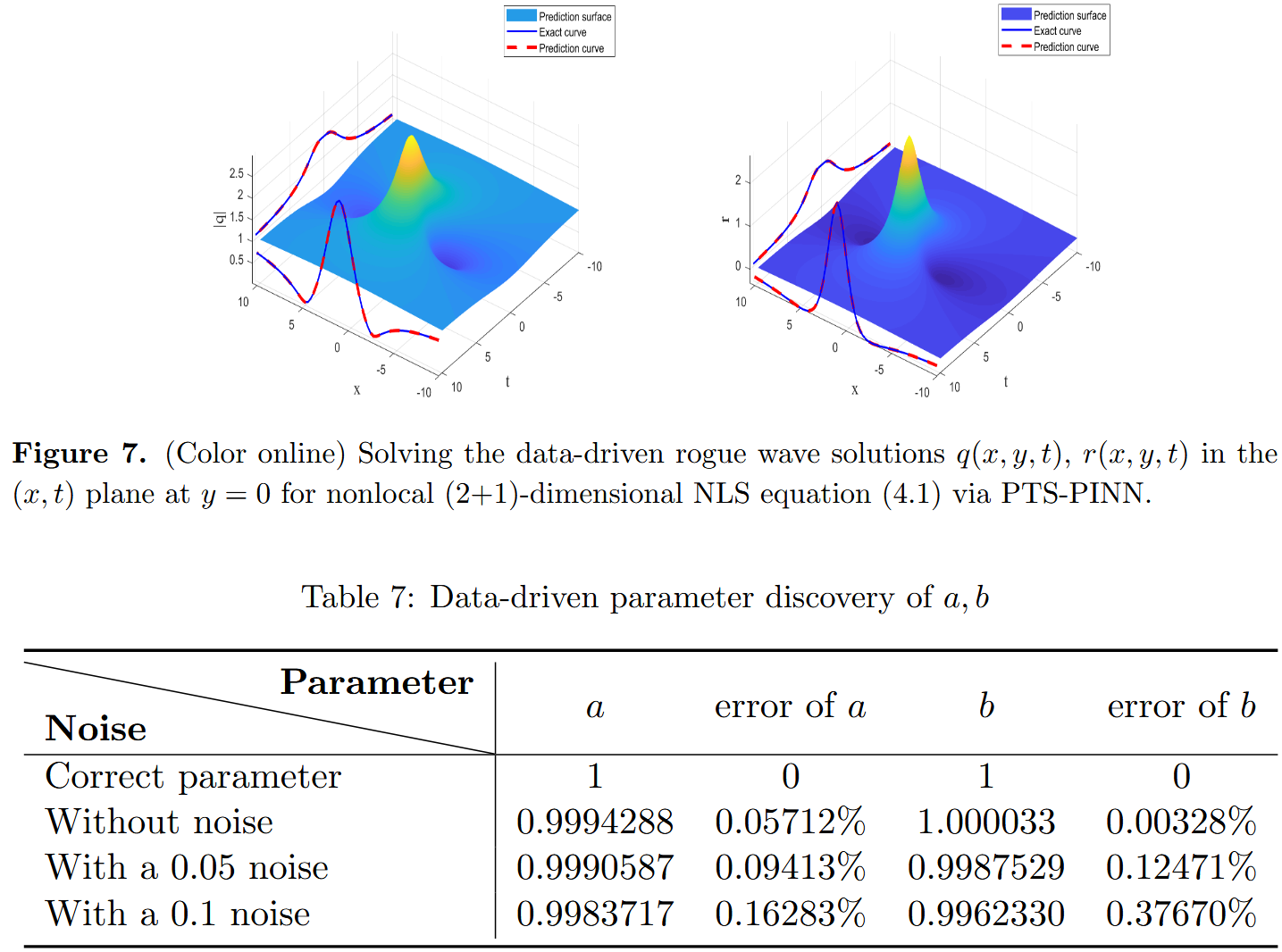本节重点研究利用 PTS-PINN 方法研究非局部方程相关的逆问题。具体来说,我们深入探讨了非局部(2+1)维 NLS 方程和非局部三波相互作用系统。非局部(2+1)维 NLS 方程以参数形式考虑