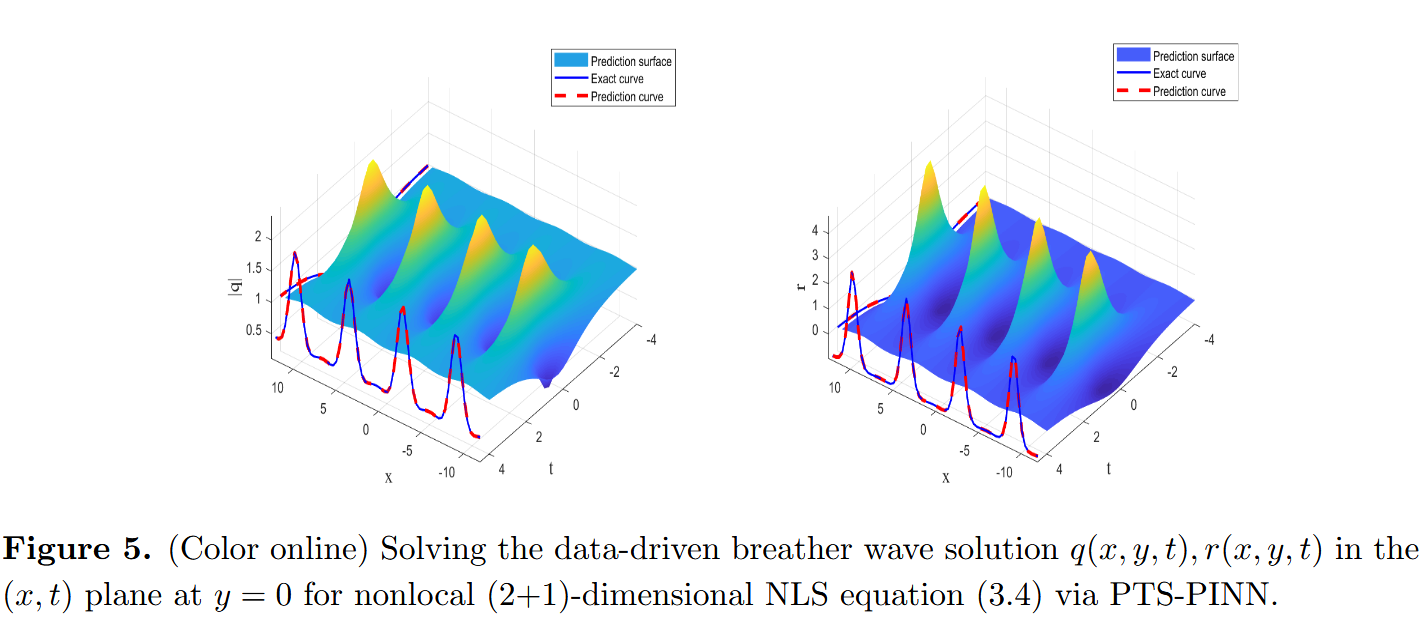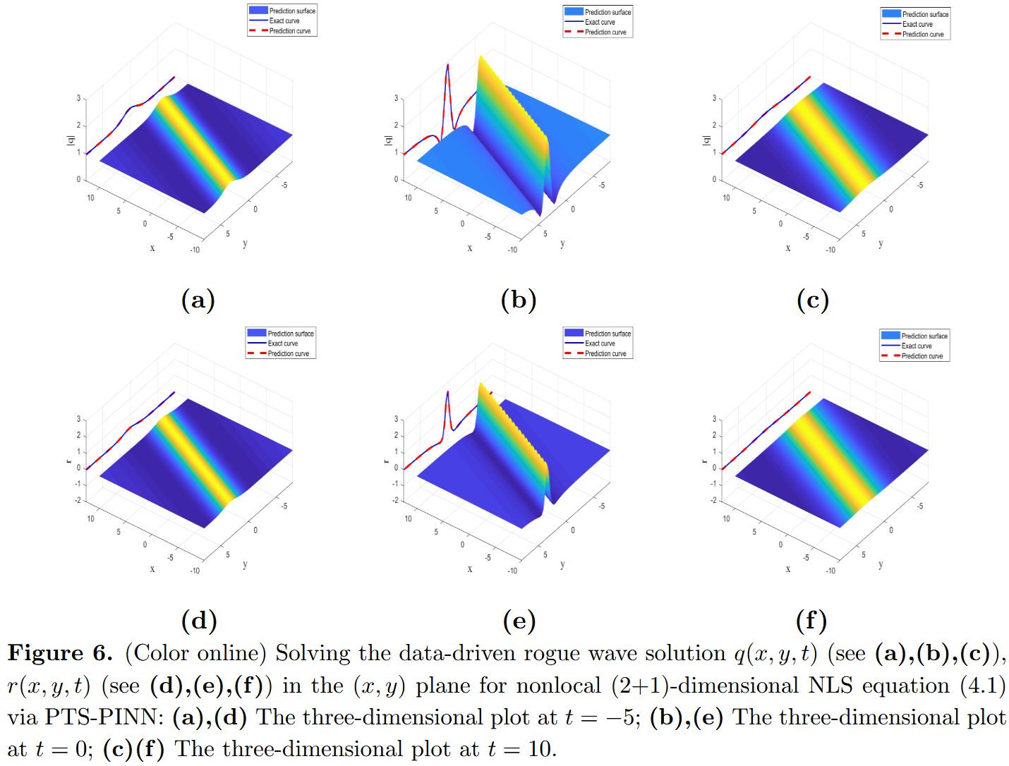 由于 PT -对称非局部方程包含 PT -对称的物理信息,因此将 PT -对称的物理信息嵌入 PINN 的损耗函数 PTS-PINN 中非常合适。对于一般的 PT -对称非局部方程,尤其是涉及非局部项推导的方程,由于非局部项的存在,直接使用原始 PINN 方法求解此类非局部方程会面临一定挑战。这个问题可以通过 PTS-PINN 方法解决,方法可以通过两个方面说明。首先,我们将方程的非局部项视为新的局部分量,因此此时方程是耦合的。通过这种方式,我们成功地避免了在神经网络中区分非局部项。另一方面,为了提高准确性,我们做了第二项改进,即将 P、T 对称的物理信息嵌入到损失函数中。通过一系列独立数值实验,我们评估了 PTS-PINN 在解决非局部非线性施尔·奥丁格(NLS)、非局部导数 NLS 方程、非局部(2+1)维 NLS 方程以及非局部三波相互作用系统的前向和逆问题方面的效能。数值实验表明 PTS-PINN 表现良好。特别是,PTS-PINN 还展现出了学习非局部方程中大规模时空尺度流氓波的非凡能力。