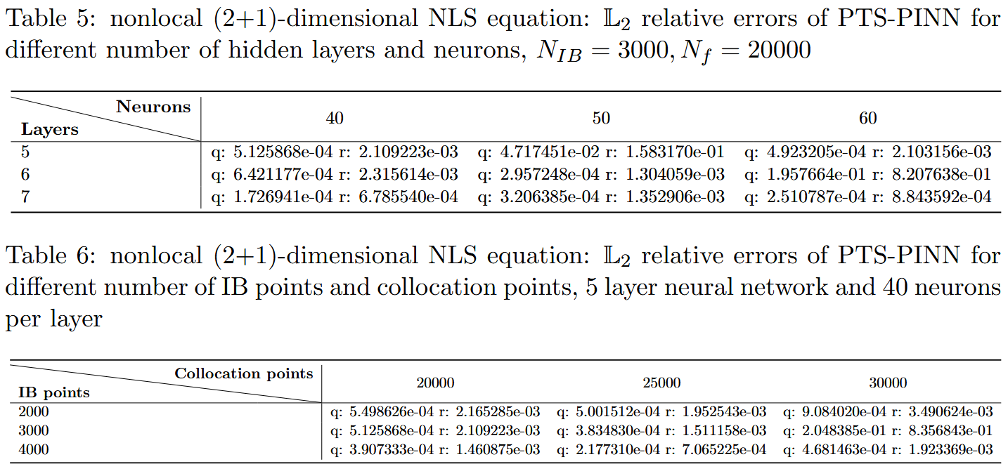 本节主要考虑若干类非局部方程的正问题,包括非局部 NLS 方程、非局部导数 NLS 方程和非局部(2+1)维 NLS 方程。这里,我们使用 Tensorflow 实现神经网络,所有数值实验均在配备 2.10 GHz 8 核 Xeon Silver 4110 处理器和 64GB 内存的 DELL Precision 7920 塔式计算机上运行。估计的准确性通过相对 L2 误差来评估,这一指标是衡量算法有效性的可靠指标。精确值 q ( x k , t k ) q(\mathbf{x}_k,t_k) q ( x k , t k ) 和训练近似 q ^ ( x k , t k ) \hat{q}(\mathbf{x}_k,t_k) q ^ ( x k , t k ) 在数据点 { x k , t k } k N = 1 \{x_k,t_k\}_k^{N=1} { x k , t k } k N = 1 处推断,误差可定义为。解析解为 q ( x , t ) = e i t 2 ( 1 − 4 i t + 4 t 2 + x 2 + 1 ) q(x,t) = e^{\frac{it}{2}}(1 − \frac{4it+4}{t^2+x^2+1}) q ( x , t ) = e 2 i t ( 1 − t 2 + x 2 + 1 4 i t + 4 ) ,即流氓波解。我们的目标是利用 PTS-PINN 推导流氓波解 q ( X , T ) q(\mathbf{X},T) q ( X , T ) ,采用一个 5 层全连接神经网络,每隐藏层 20 个神经元,并采用双曲切线(TANH)激活函数。在 MATLAB 中,采用传统的有限差分法,通过将空间区域 [ − 5 , 5 ] [−5,5] [ − 5 , 5 ] 的解析解离散化为 512 个点,将时间区域 [ − 5 , 5 ] [−5,5] [ − 5 , 5 ] 离散化为 400 个点,生成初始训练数据。原始训练数据包括 IB 数据和内点。使用拉丁超立方体抽样(LHS)方法[60],N I B = 300 N_{IB} = 300 N I B = 300 个数据点从原始 IB 数据中随机提取,Nf = 10000 个点作为内层点的配址 点。使用该训练数据执行 PTS-PINNs 方案后,数据驱动的流氓波解 q ( x , t ) q(\mathbf{x},t) q ( x , t ) 以 L2 范数误差为 9.491509e-03 学习,相较于精确解。整个学习过程包含 30,149 次迭代,耗时约 968.9108 秒。相应的动态行为如图 2 所示,展示了沿 x 轴和密度图的波传播模式。图 2 中,学习动力学与真实动态之间的误差范围为-0.025 至 0.025,显示了 PTS-PINN 的有效性。此外,我们分析了不同隐藏层数、每层神经元数、IB 点和配位点的相对 L2 误差,见表 1、表 2。这些表格中呈现的结果表明了一个显著结果:PTS-PINN 的 L2 相对误差始终稳定地达到 e-02 甚至 e-03。总之,PTS-PINN 的优越性能显而易见。