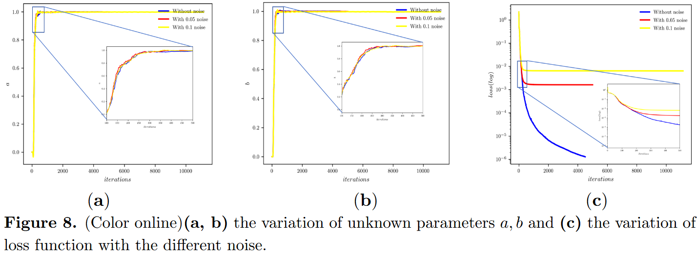 在逆问题的背景下,我们仔细观察未知参数和损耗函数在不同噪声水平下迭代次数的变化。图 8(a)和(b)展示了在不同 噪声条件下迭代时未知参数的变化。值得注意的是,我们观察到即使在噪声存在的情况下,PTS-PINN 在大约 300 次迭代后仍能有效学习未知参数。图 8(c)显示了随着迭代次数增加,在不同噪声水平下损失函数的波动。研究结果表明,随着噪声水平的升高,收敛效应逐渐减弱。这强调了噪声对学习过程收敛行为的影响。