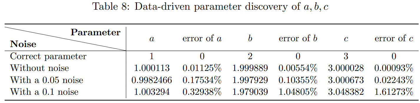 相反,PINN 也证明了解决与非局部可积偏微分方程相关的逆问题的有效性,即未确定参数和数值解同时学习。在方程(2.1)中存在未知参数的情况下,这些参数可以通过在标记训练点 { x l i , t l i , u R i , u I i , v R i , v I i } i = 1 N l \{x^i_{l},t^i_{l}, u^i_R,u^i_I,v^i_R,v^i_I\}^{N_{l}}_{i=1} { x l i , t l i , u R i , u I i , v R i , v I i } i = 1 N l 集合中加入额外的测量值 \(\hat{u}_R(\mathbf{x},t;θ),\hat{u}_I(\mathbf{x},t;θ),\hat{v}_R(\mathbf{x},t;θ),\hat{v}_I(\mathbf{x},t;θ)\) 来获得。这涉及引入额外的数据丢失项
